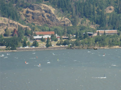 With Mt. Hood hiking a disappointment (and lesson for the future), we headed north to Hood River, where we’d booked a crappy little efficiency with what turned out to be a spectacular view of the Columbia River. Interesting fact: Hood River is a mecca of sorts for wind surfers in the late spring and early summer. A constant winds blows eastward up the river and is apparently at its strongest around Hood River. Wind surfers come from all over the world to take advantage of perfect conditions. No matter how early we got up, if it was daylight, there were mad surfers out there.