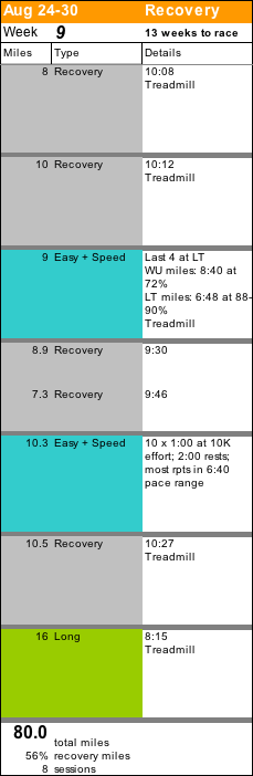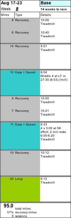 The heat and humidity eased a bit in the middle of the week, allowing me to comfortably do a few of my runs outside (something for which I was very happy). Then the outer edges of Hurricane Danny skirted the east coast and wrecked the prospects of having two decent outside weekend runs.