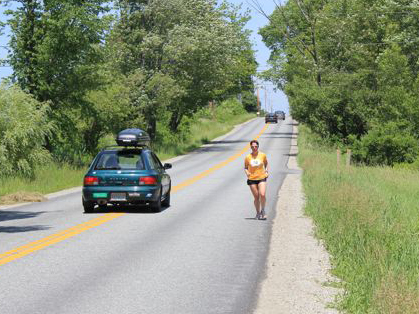 I started my run and immediately passed a runner from one of the slower teams. For the next few miles, I ran alone. I felt remarkably good considering my oven-running ordeal earlier. The experience of night racing was one of shifting, sensual impressions. I was not really paying attention to pace or distance. Aside from passing cars and race vans (and a few huge tractor trailers, all of whom considerately moved over and gave me room), I was aware of just a few things: the rhythmic slapping of my flats on the pavement, the sounds of dogs barking in the distance and the constellation of gnats illuminated by my headlamp, and which I had initially mistaken for drizzle. I really enjoyed this run.