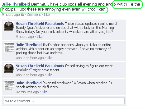 “I am driving with Sandra” was not accurate. I was, in fact, sitting somewhere in my home. We don’t know where, since there is evidence that I made my way around several rooms of the house last night. This may have been posted from the guest room. It’s worth pointing out that in order to post these messages, I had to first unearth my iPod from the bowels of my gym bag, which was in the entrance hall. Upon closer examination, it appears all Facebook updates were sent from my laptop (iPod messages are labeled as such). So I went from sitting on the couch thinking, “I feel really sleepy” to instantly being in a state of altered conscious. The brain is an amazing contraption.