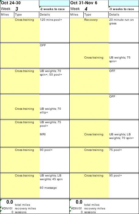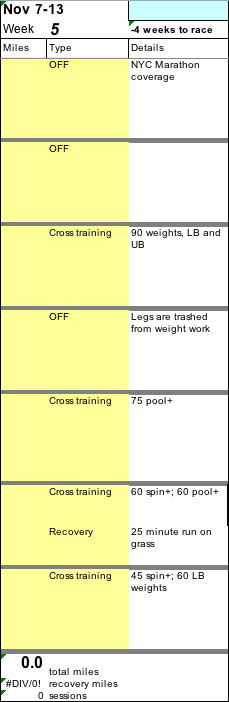 I was a cross-training machine in mid-to-late October, but things dropped off in the last two weeks. These were two incredibly busy weeks for me with work commitments (I have two big freelance projects these days with many due “deliverables,” as we call them), the NYC marathon — and lots of time spent in in the medical realm.