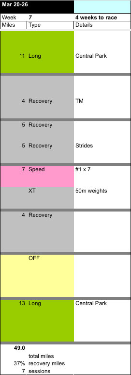 Another uneven week. I had a horrible run last Sunday, owing to exhausted legs and a hamstring that seems to now reliably conk out after about 10 miles. I look it easy after that run and was rewarded for my patience and discipline with an extremely good speed session on Wednesday.