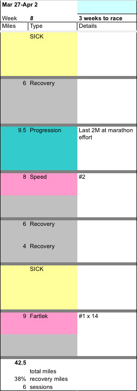 One thing I did during that pre-race week was to take Sunday off and then move the progression run up a day so I could have a day recovery between that and the track session. Sandra had originally scheduled them back to back on Tue/Wed, but I felt that would be too much to handle. This arrangement worked well. I may try it again before my next shorter race (the Mini 10K in June).