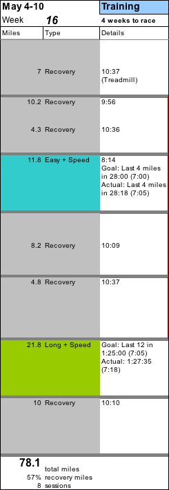 Lots and lots of runners I follow are mourning their downtime-induced loss of speed. I know exactly what they’re talking about. My tempo pace is probably 30-40 seconds per mile slower than it was two months ago. 8-10K pace is about what my tempo pace used to be. Recovery runs are only a little slower than they used to be (although I always ran them on the slow side once the mileage got above 70 mpw). I haven’t attempted much in the general aerobic range, but I’ll be dipping my toes back into that world tomorrow.