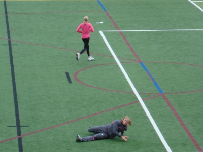 But while you’re in the first call room, you’re literally sitting in a small room with all the people you’re going to be racing. It’s usually really quiet. It’s kind of tense. By the time you get to call room two people are kind of shaken out again, they’re doing their strides, putting their shoes on. At that point — this what you all see — in our warmups, with our backpacks, we all walk out onto the track. At the point we usually have about five minutes, just enough time to put in one or two strides before we have to take all of our clothes off and step to the line.